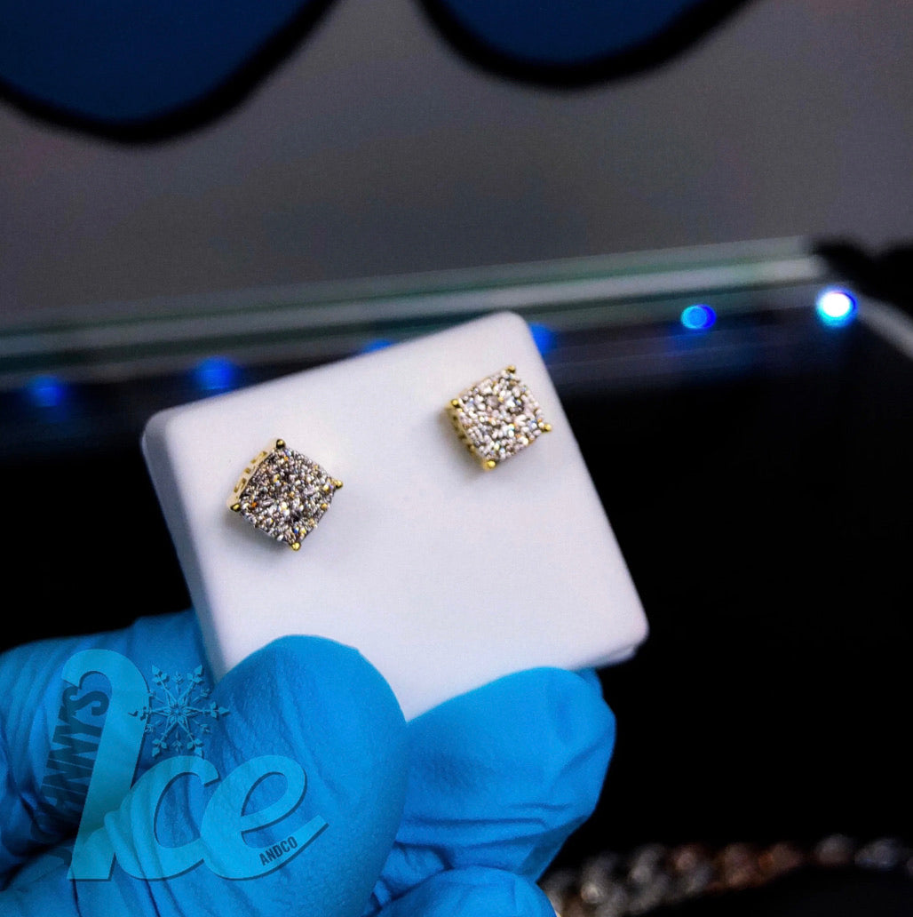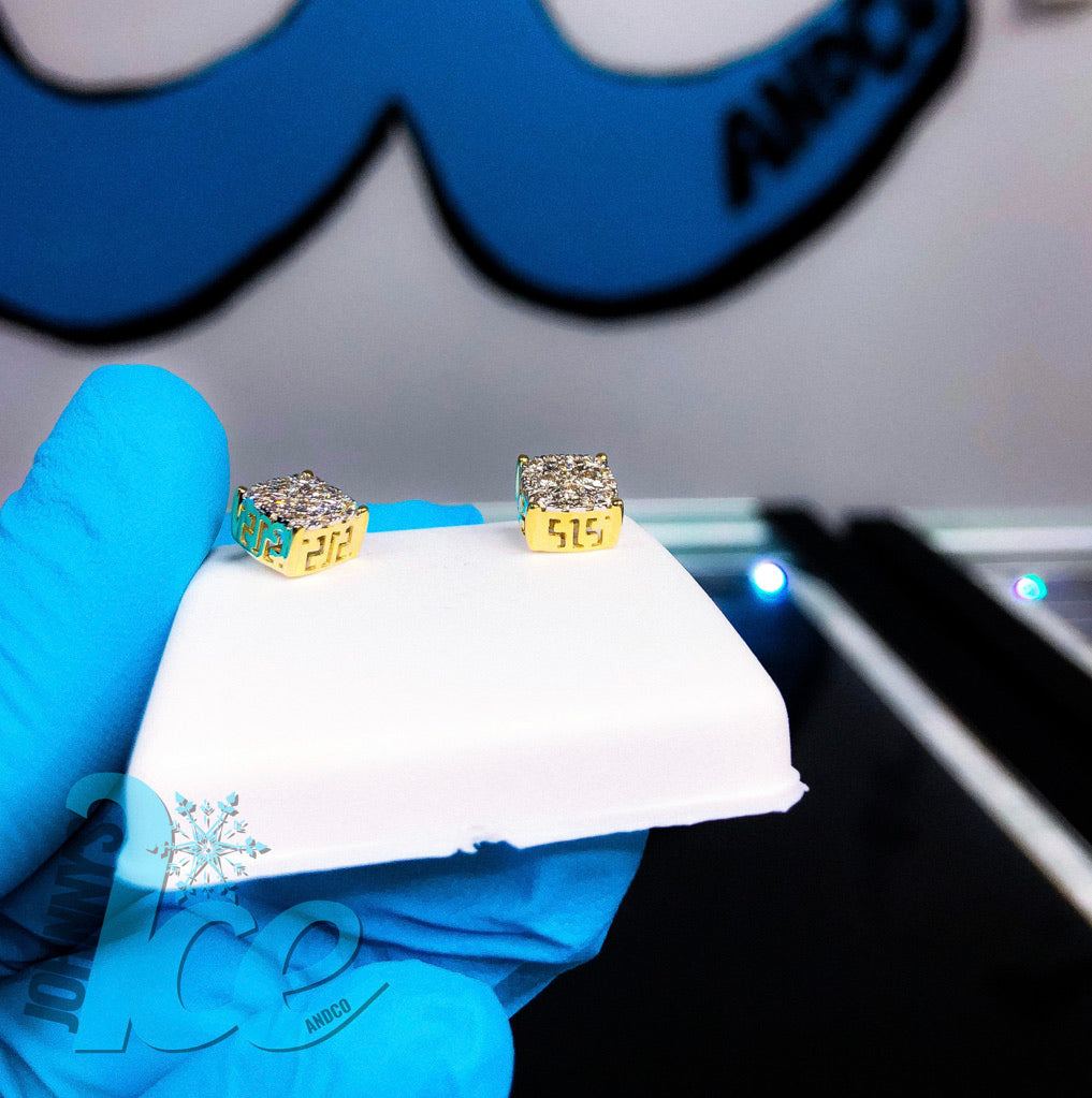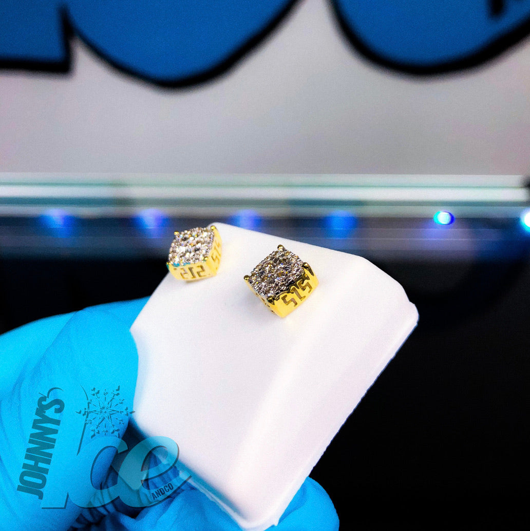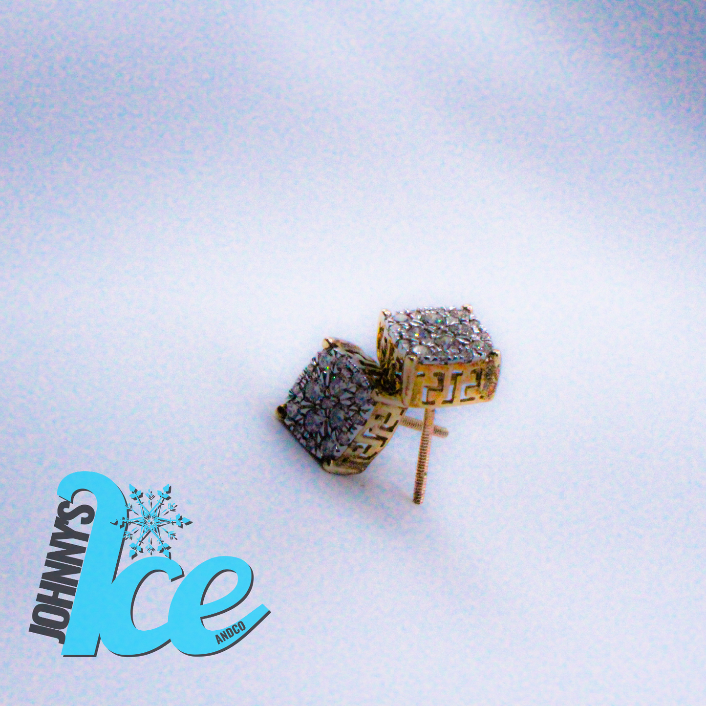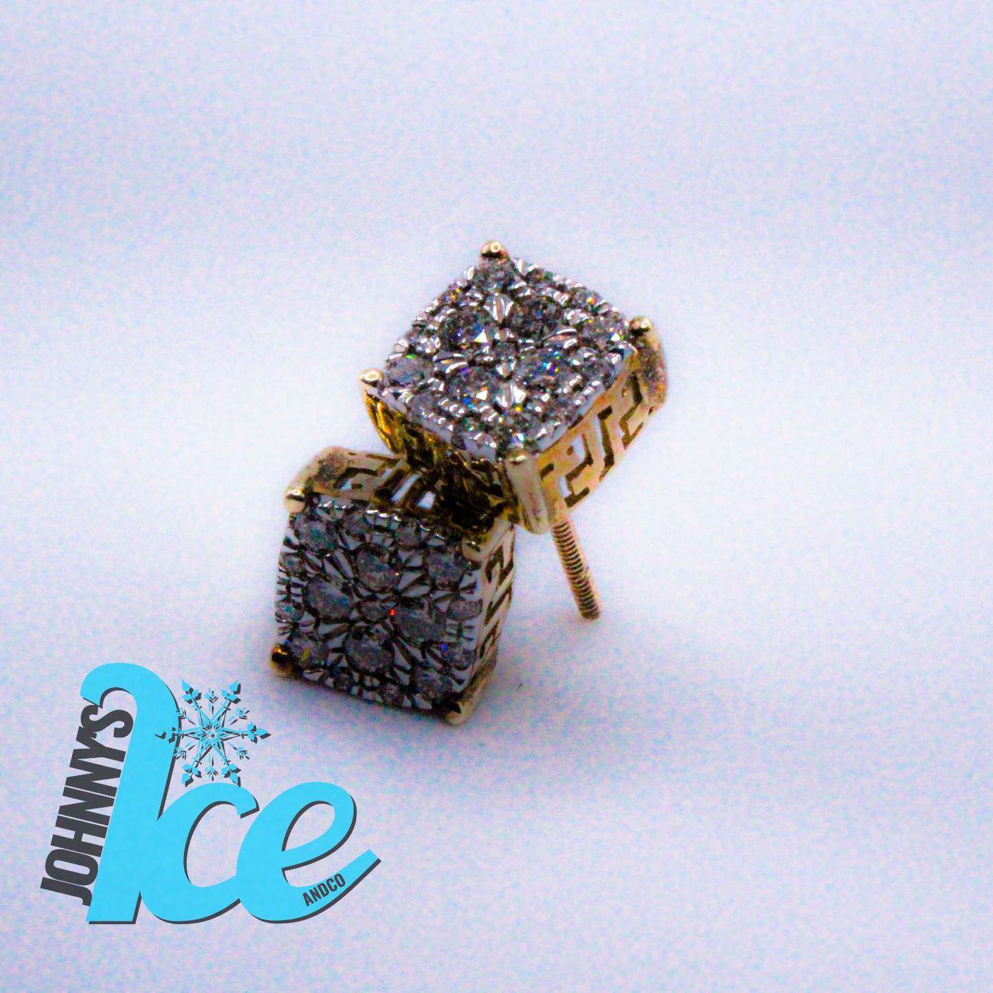 Handcrafted, custom Versace Print square cluster earrings. Fit with graduating SI2 diamonds, the size difference of the diamonds makes the shine that much better! Made by our Johnny's Ice and Co. jewelers!