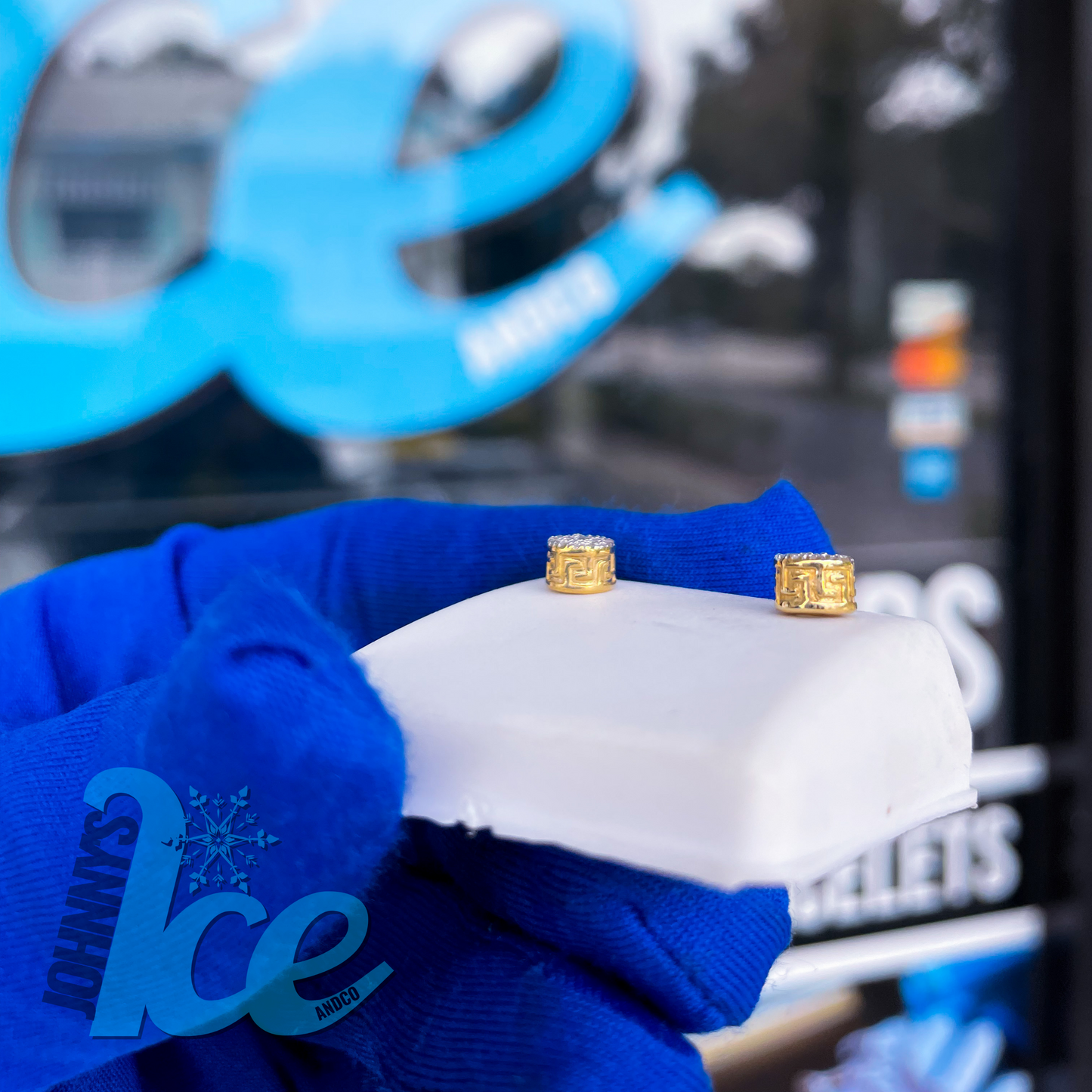 HUGE SELLER! GET WHILE THEY LAST! 10k Solid Yellow Gold with a special Versace Print all along the border! Fit with SI2 diamonds, these earrings are custom made by our Johnny's Ice and Co. jewelers!