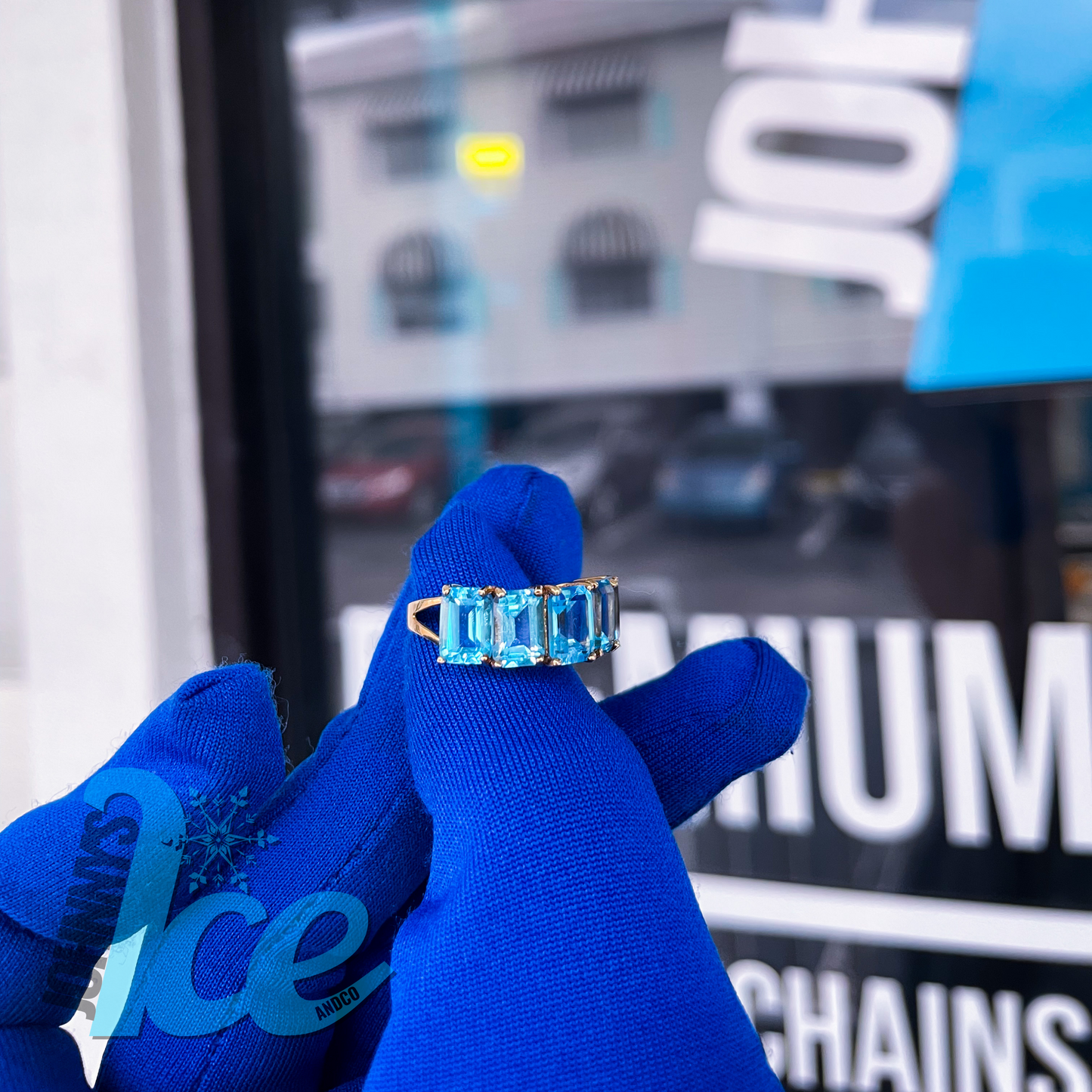 Premium, hand-crafted 10k solid yellow gold ring, fitted with 2.70 carats of emerald cut blue topaz gemstones.