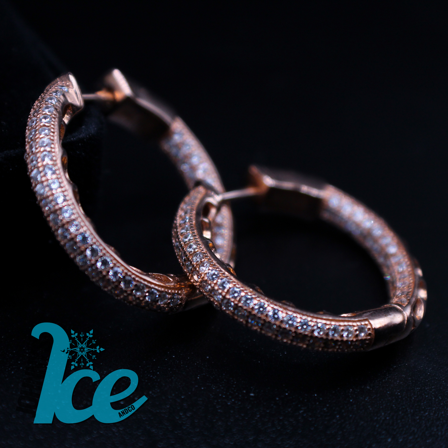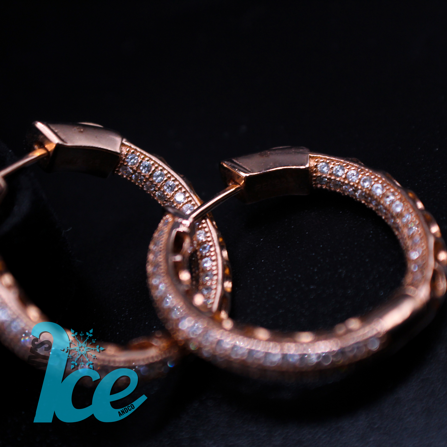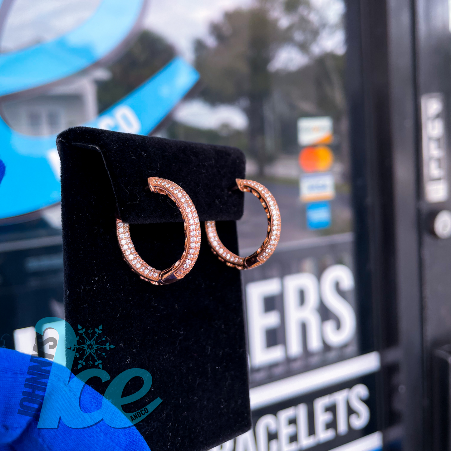 Premium style 14k Rose Finish Hoops Bussdown with Simulated Diamonds. Easily wearable, these earrings are the first of many hoop earrings to be introduced to our wide variety of stock. Made by our Johnny's Ice and Co. jewelers!