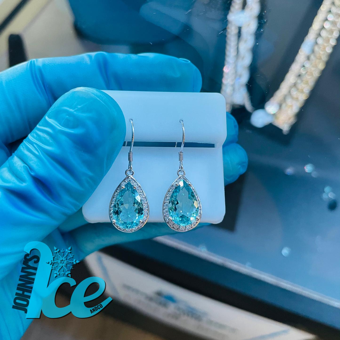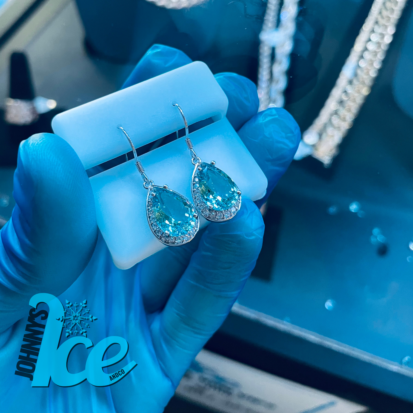 Handcrafted, custom made 6 carat Aquamarine gemstone earrings clustered with diamonds. Made by our Johnny's Ice and Co. jewelers!
