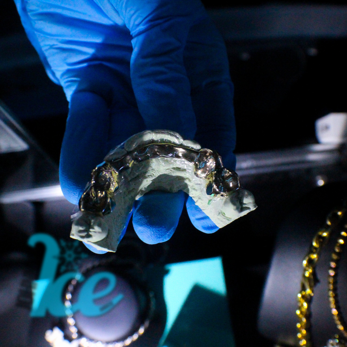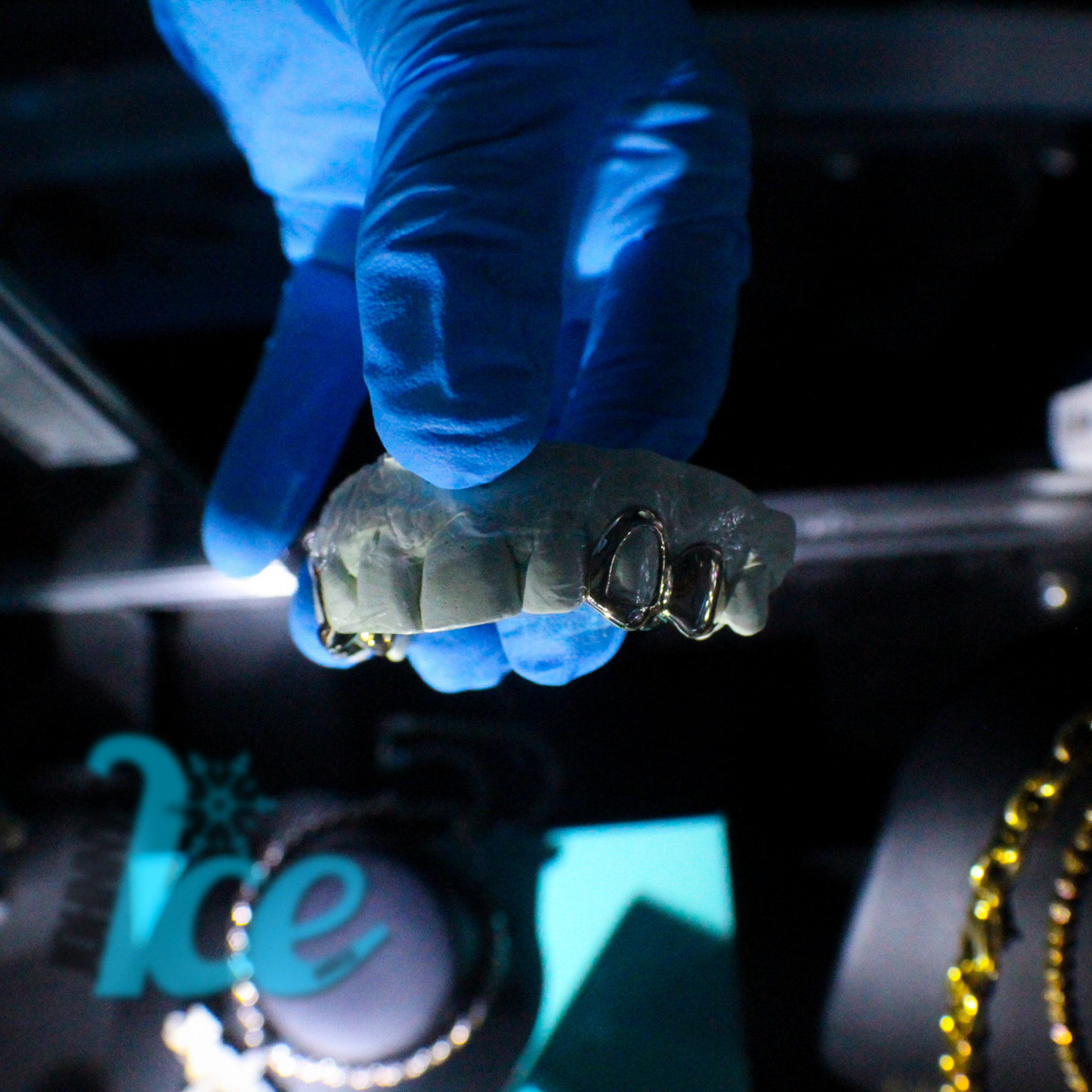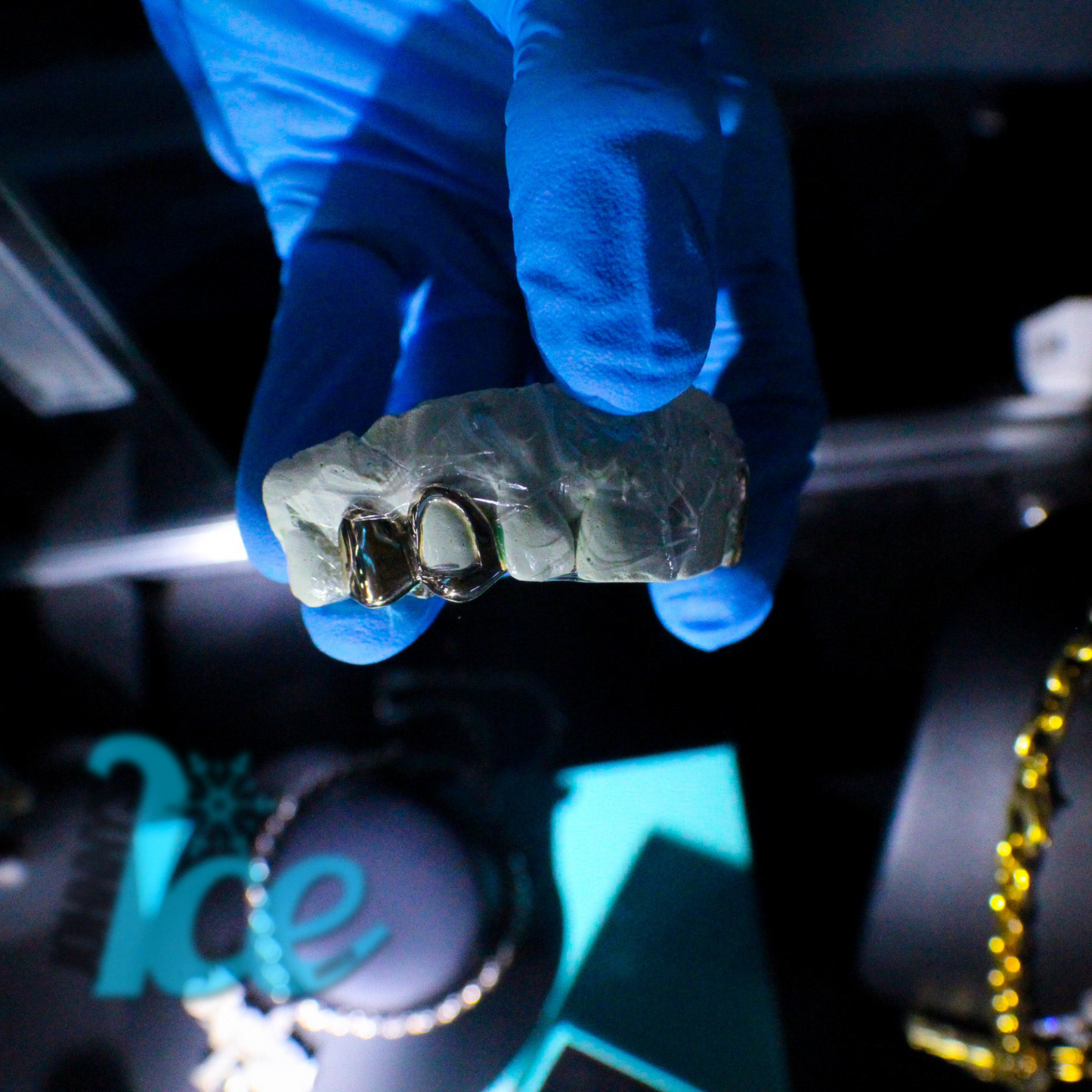 Premium, professionally molded grillz set to your teeth.