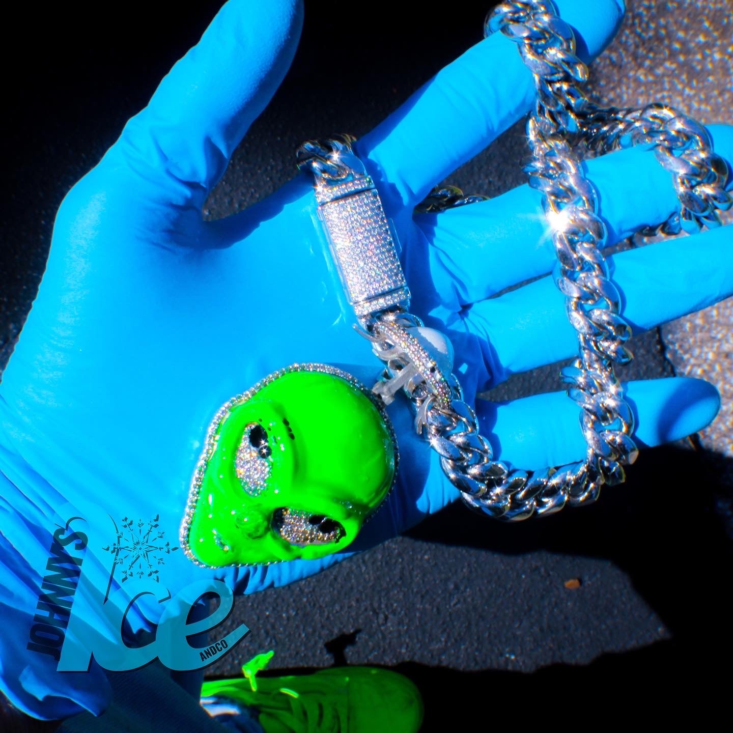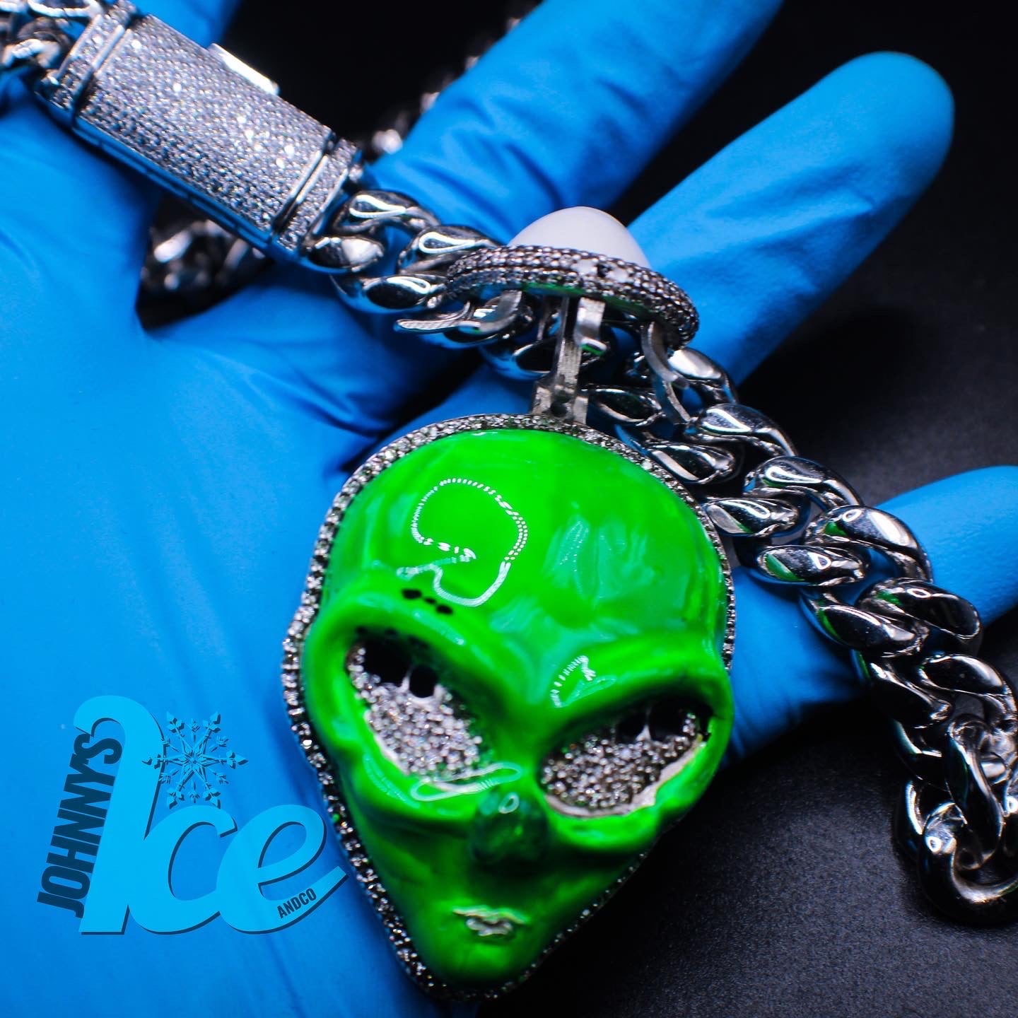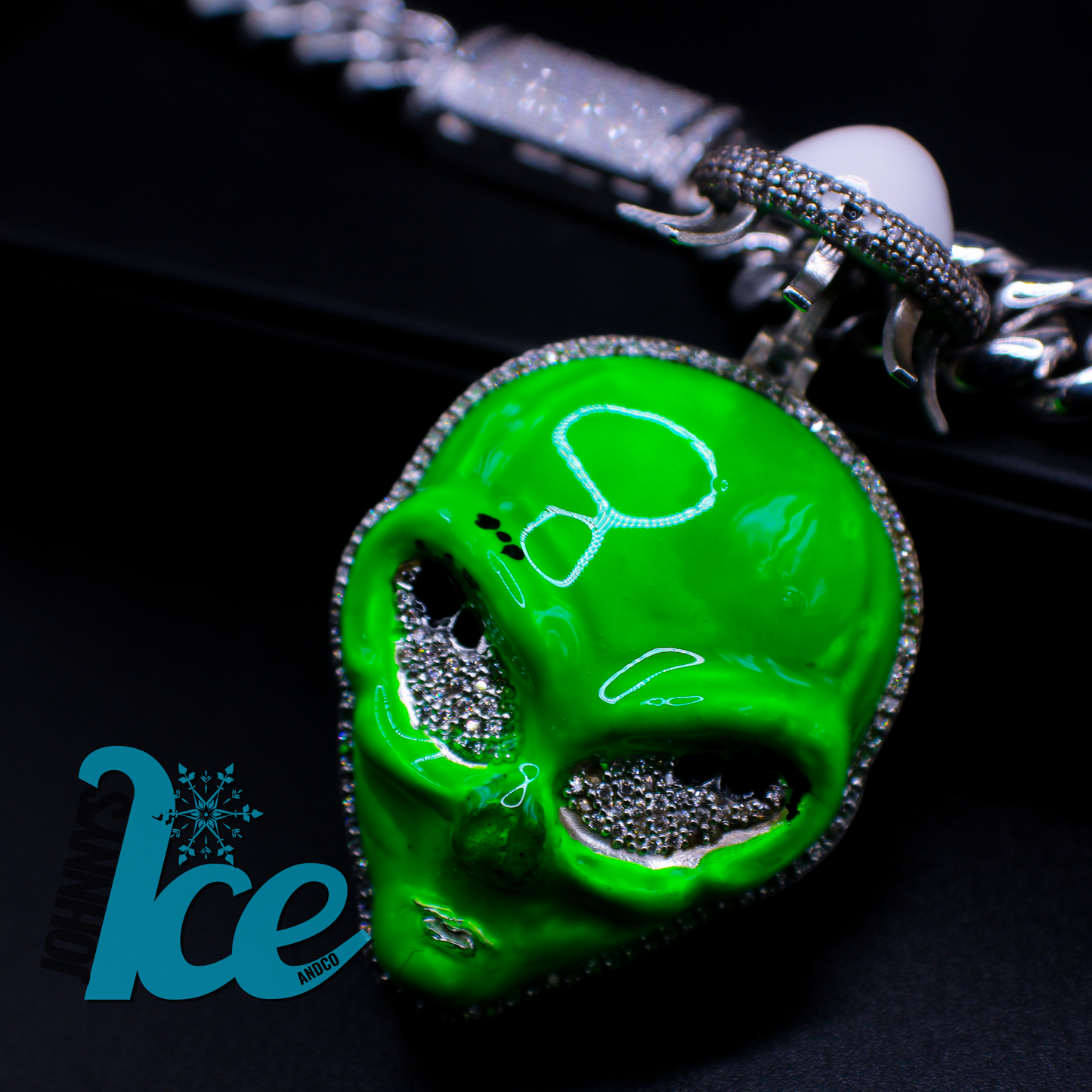 The First to drop a UV Alien Glow in the Dark Pendant. Johnnysiceandco brings you our featured Enameled Alien Head with a UFO bail!