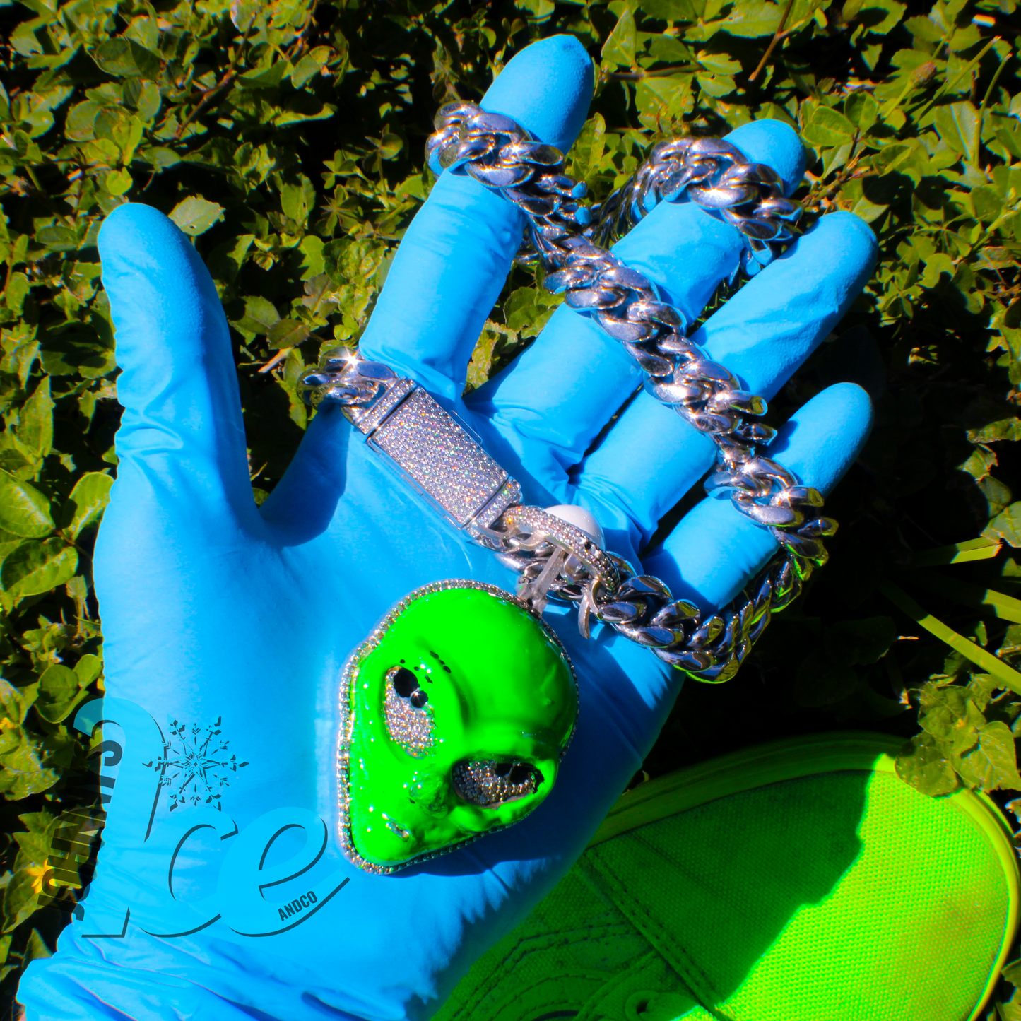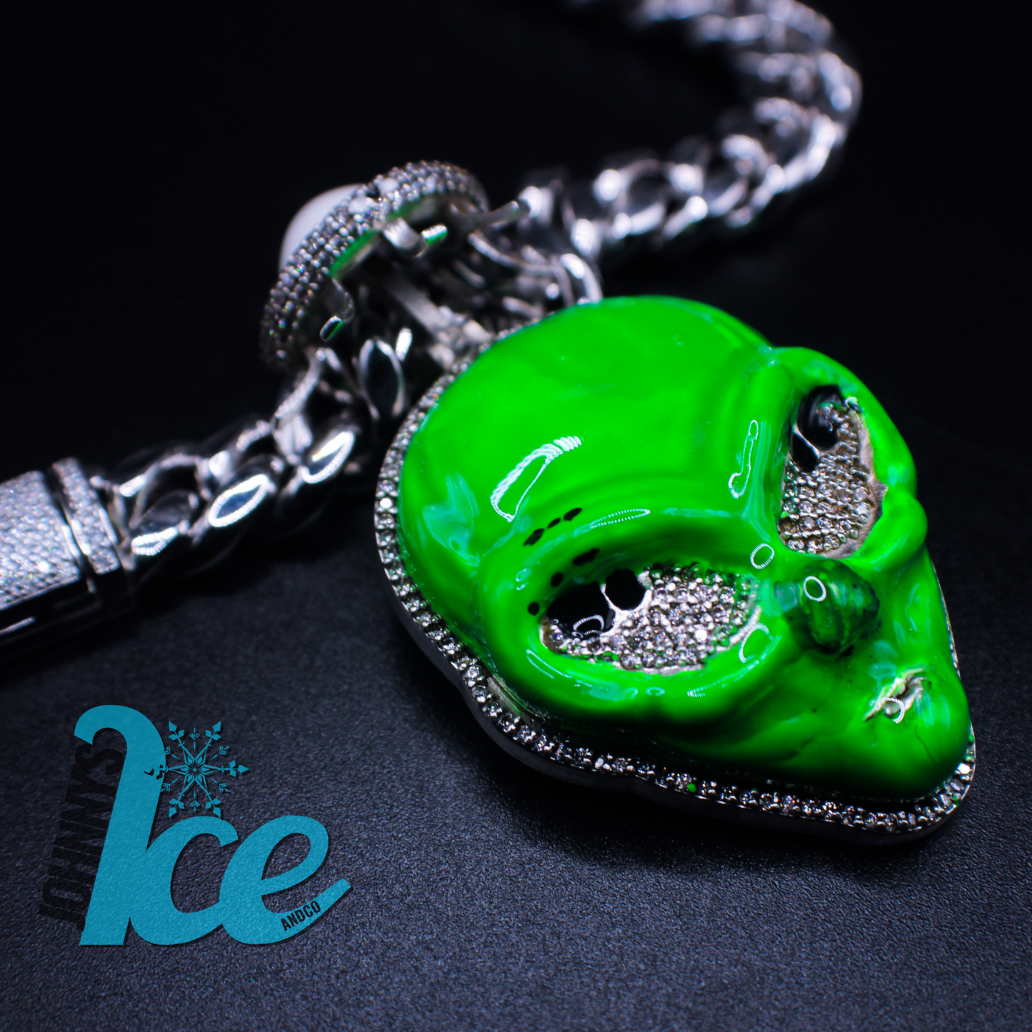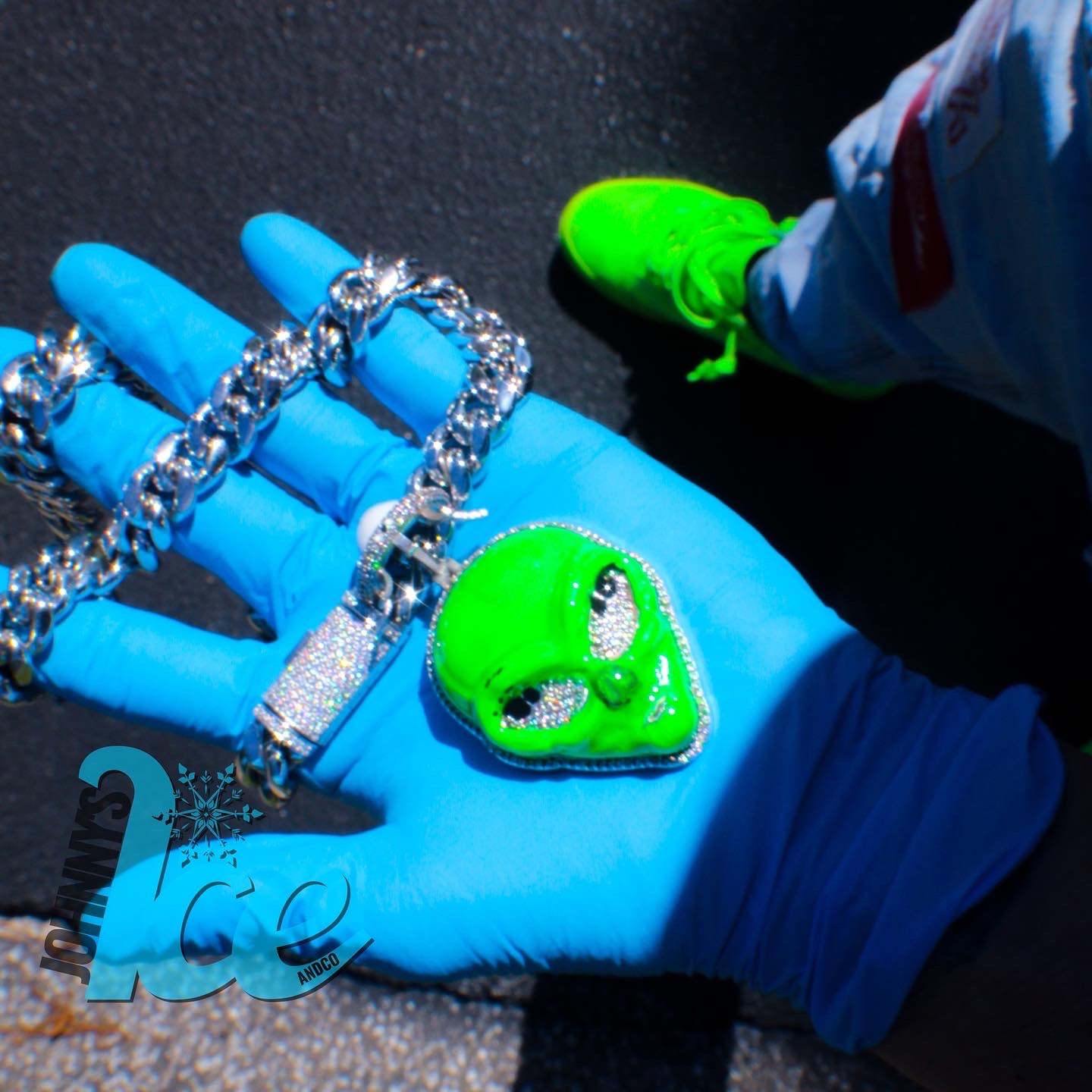 The First to drop a UV Alien Glow in the Dark Pendant. Johnnysiceandco brings you our featured Enameled Alien Head with a UFO bail!