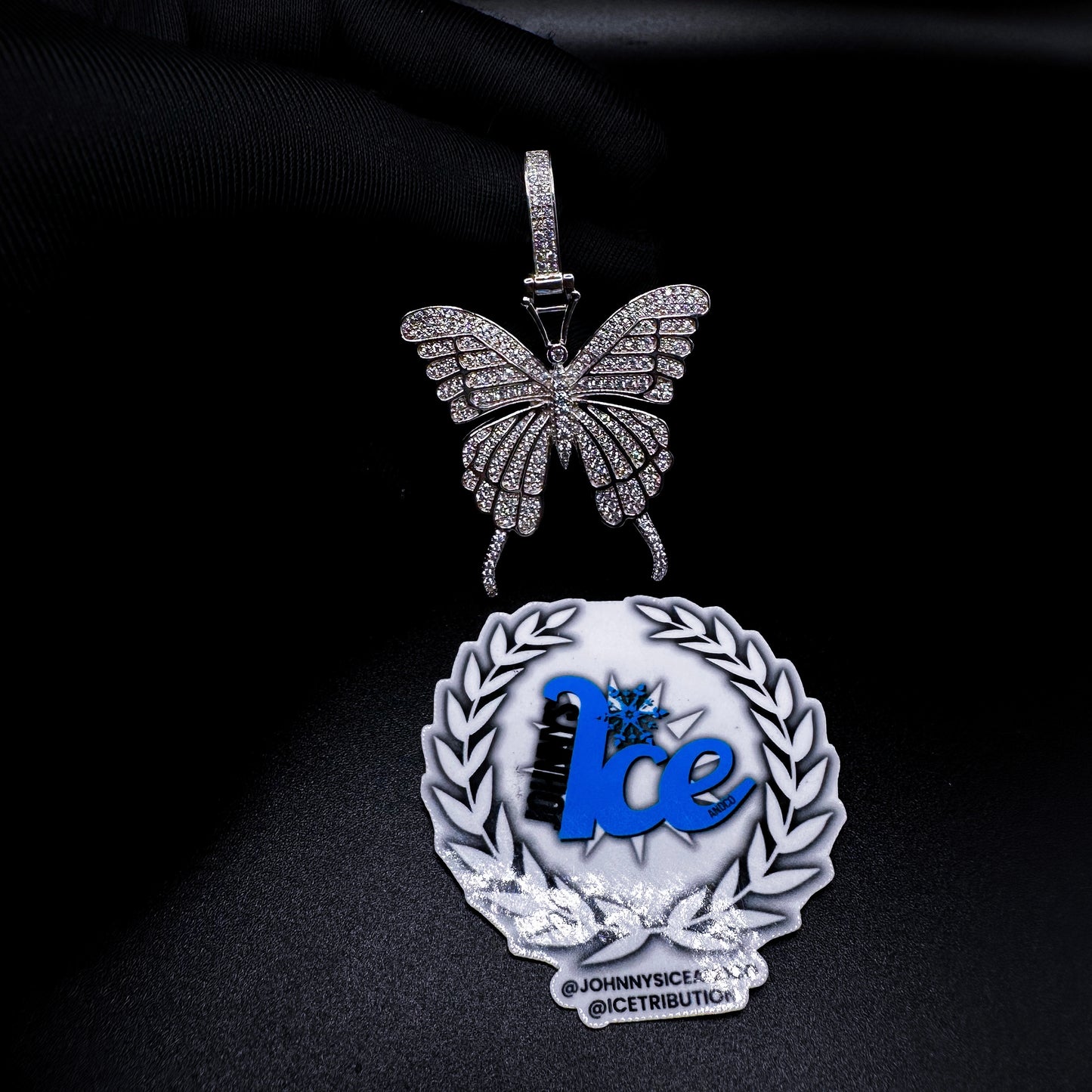 direct face view of the butterfly pendant with johnnysiceandco logo in the background