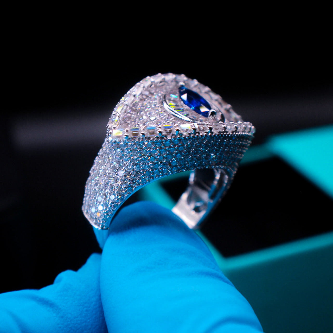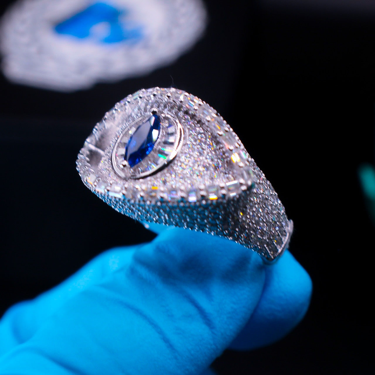 Diamond ring with a blue gemstone held by a gloved hand against a dark background
