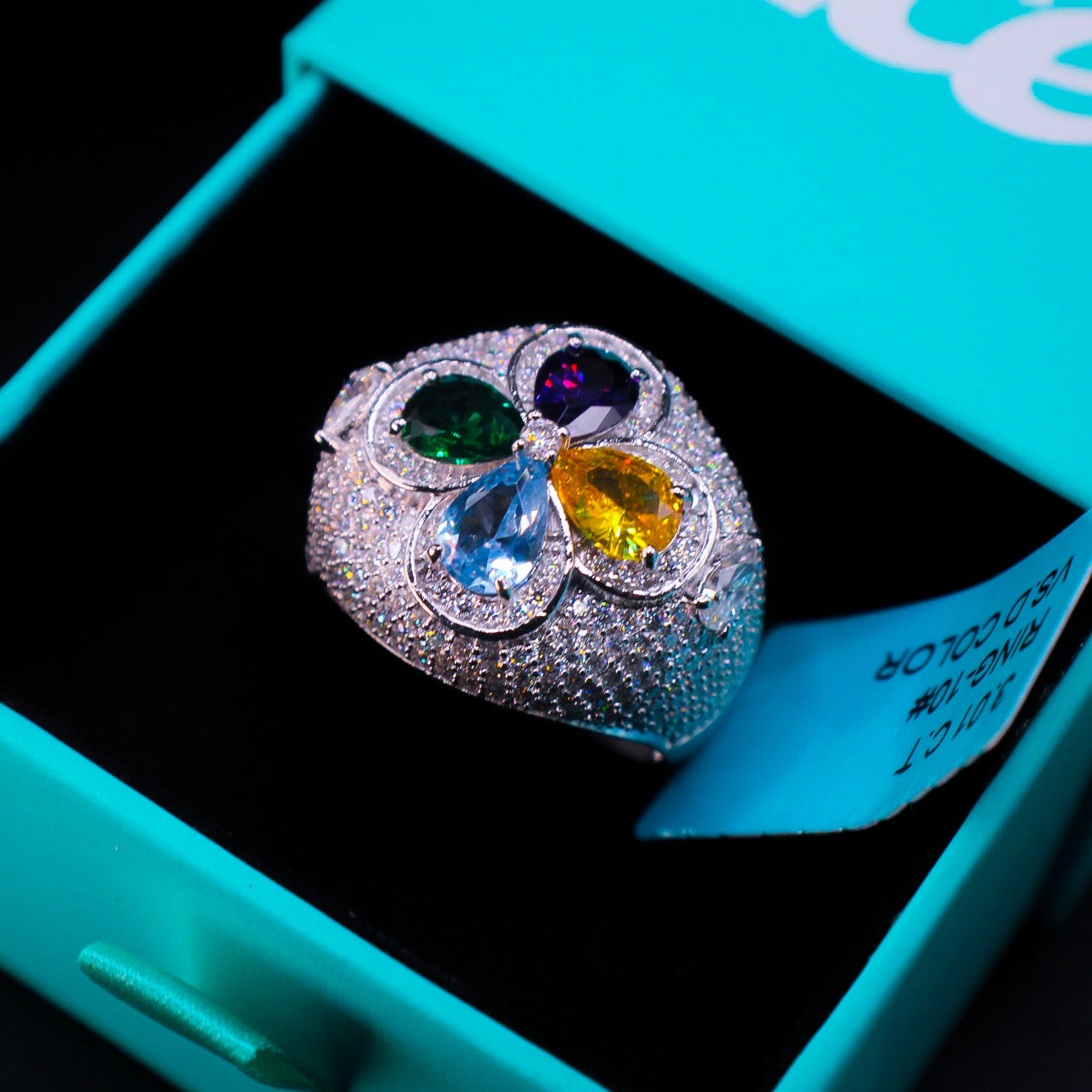 a show-stopping statement ring featuring four dazzling main gemstones surrounded by pear-shaped accents, all fully flooded with sparkling stones.