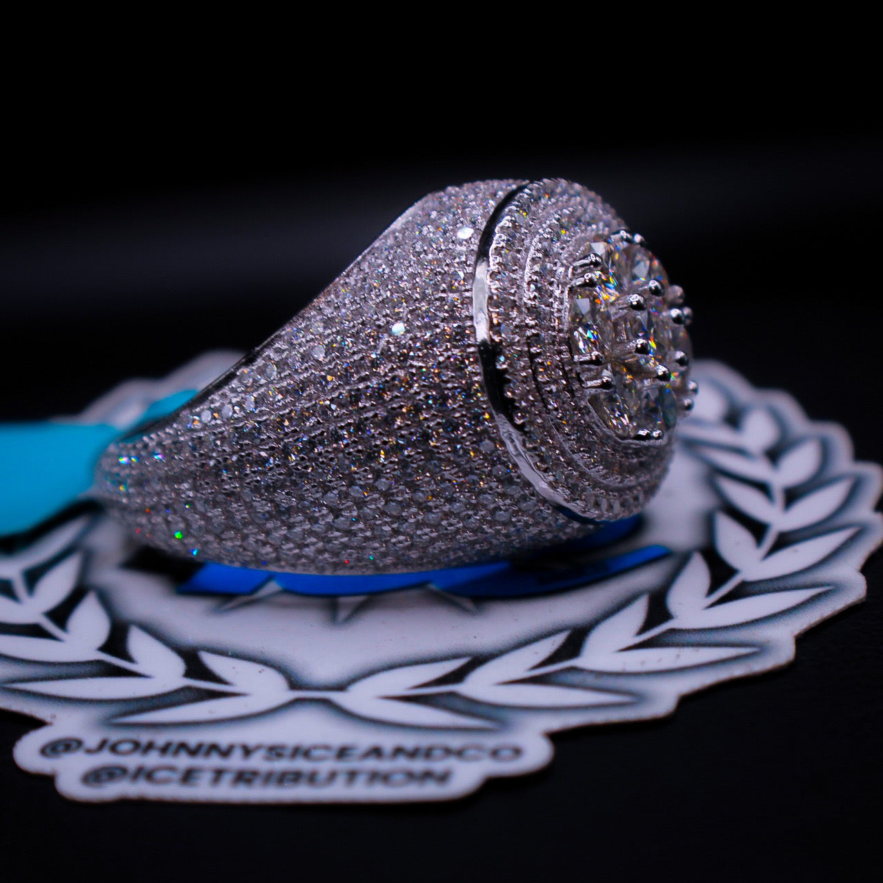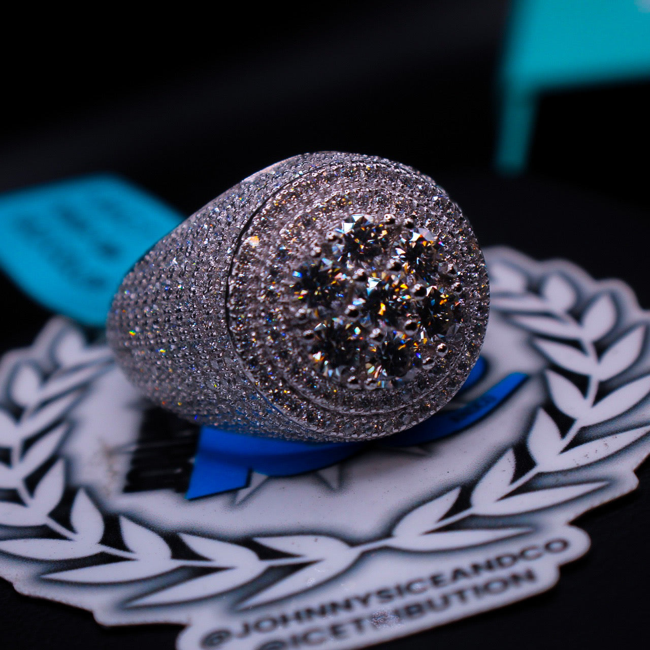Silver ring with diamonds on a decorative stand with 'Johnny's Ice and Co' branding.