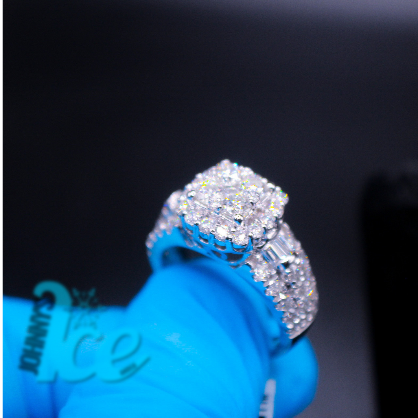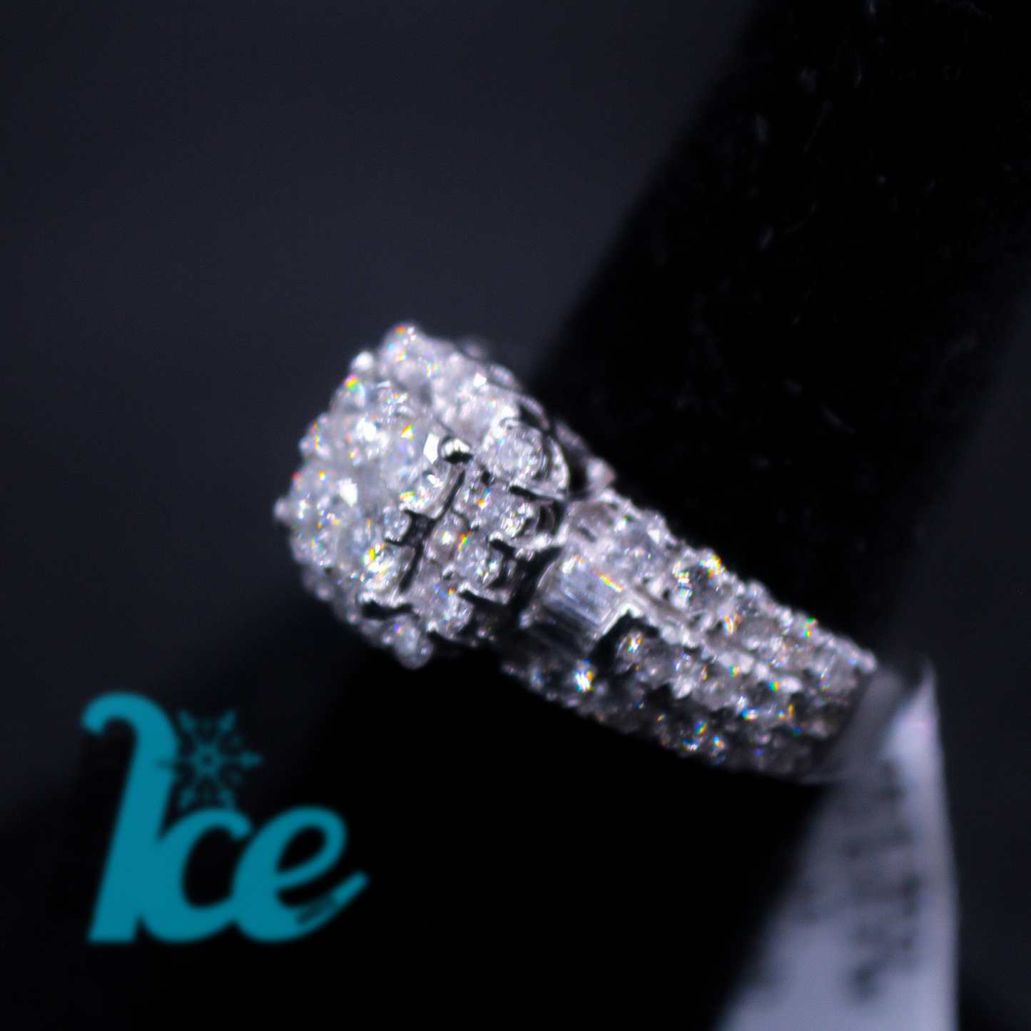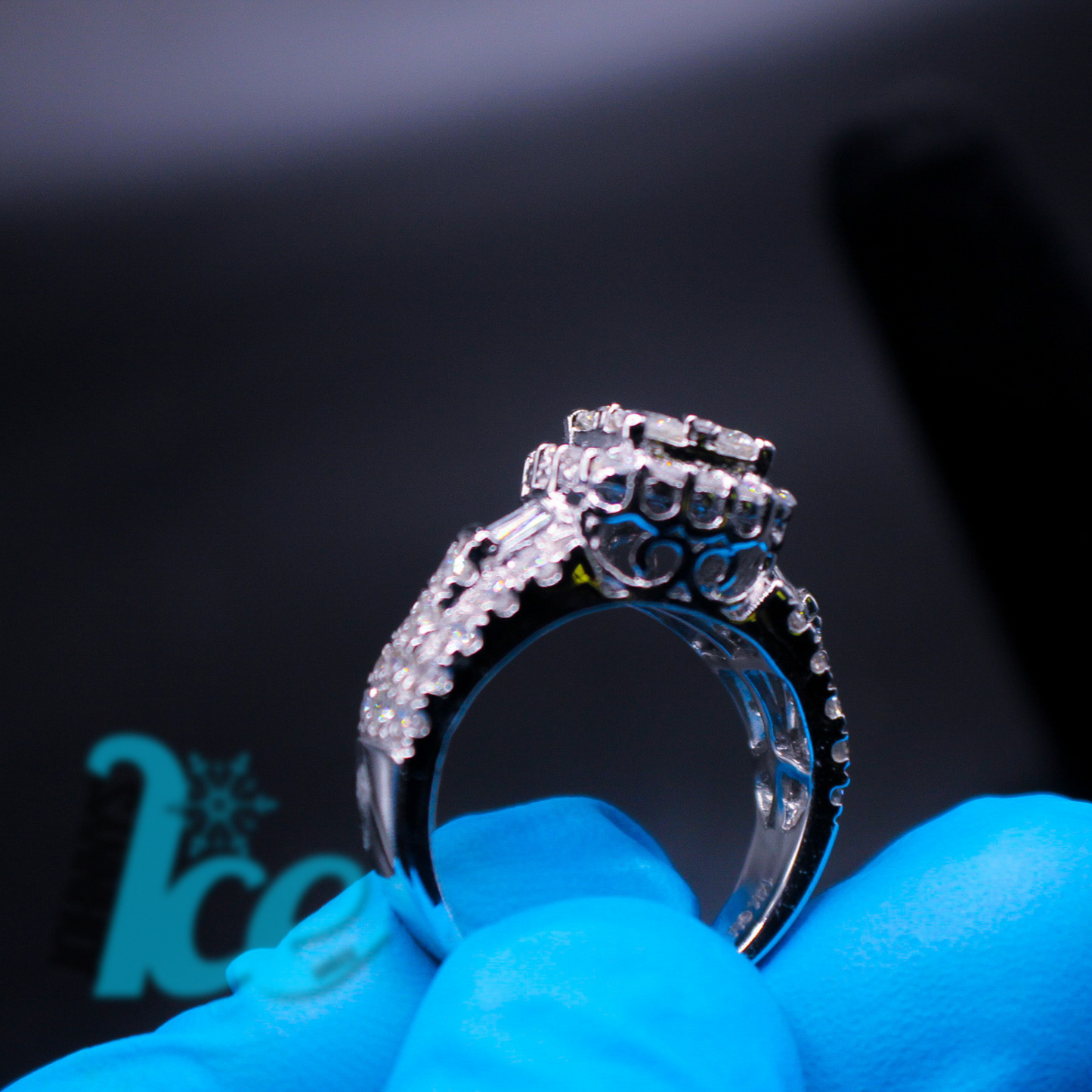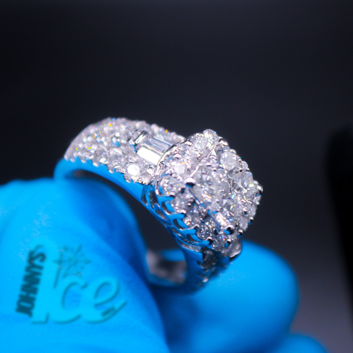 This 14k white gold VS1 Bridal set boasts 4 half carat main stones, complemented by intricate handset baguettes on the shoulder detailing.
