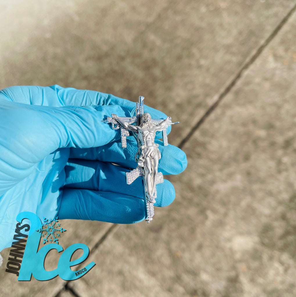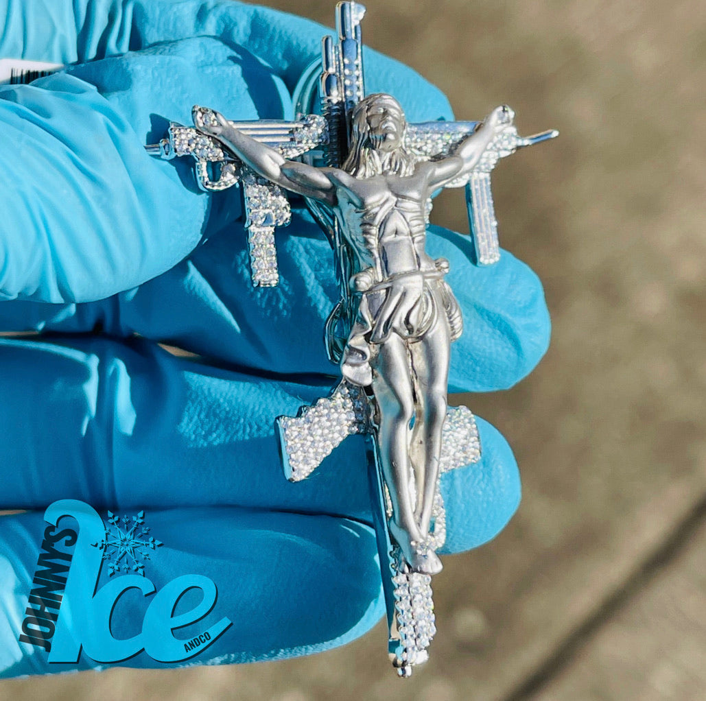 Specially Hand-crafted and one-of-kind-style pendant brought to you by our jewelers @ JIAC featuring handset stones on the lower level of the pendant all soldered on top of a matte Jesus finish.