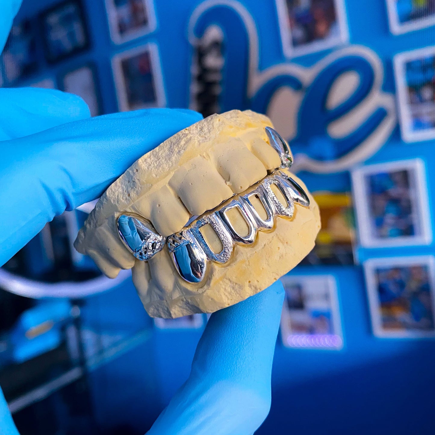 Premium, professionally molded grillz set to your teeth.