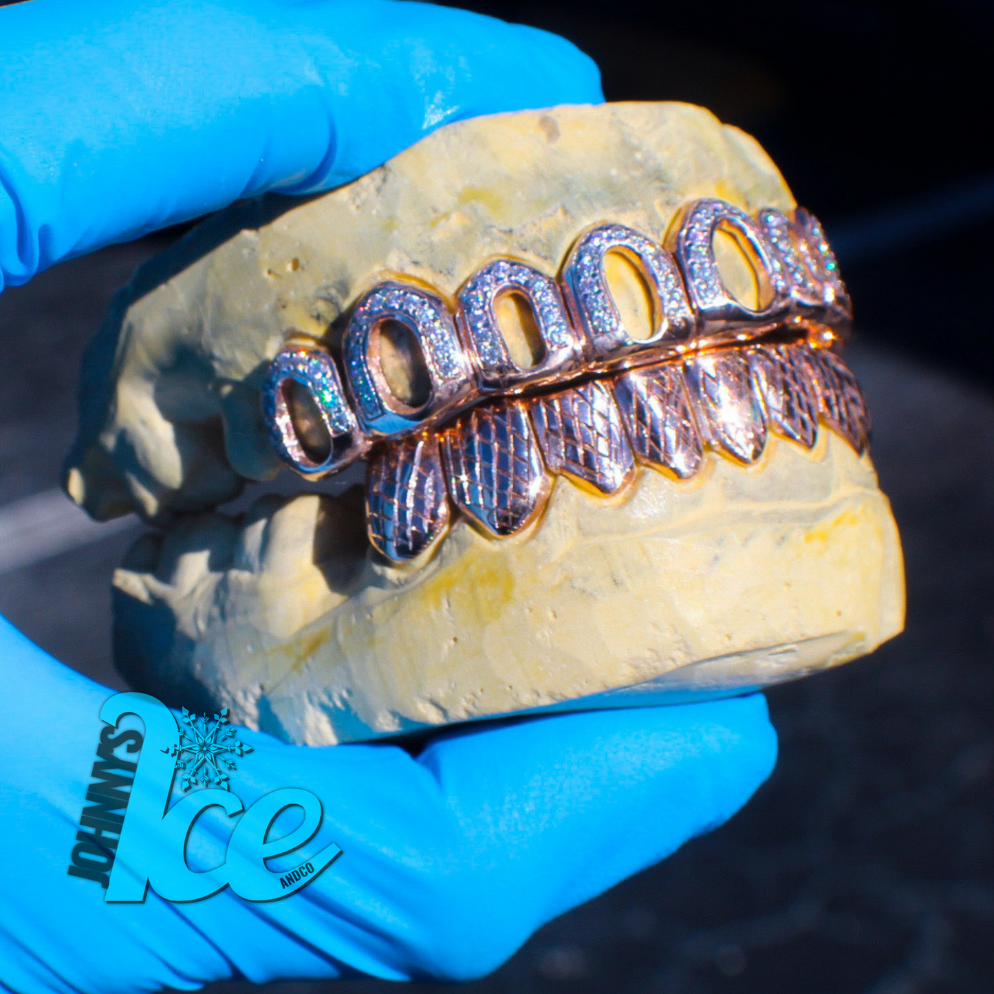 Premium, professionally molded grillz set to your teeth.